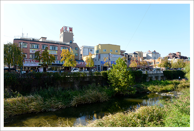 The view of the wall crossing the bridge, and the view looking back toward the market.