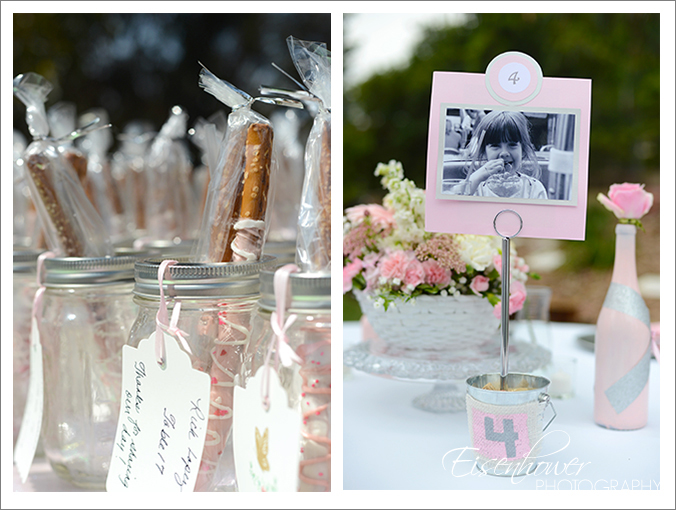 Multi purpose: delicious treats, tucked into mason jars that the guests would use throughout the evening, marked with their individual table numbers. And I loved the old photos of Jessica and Blaine that marked each table. So cute!