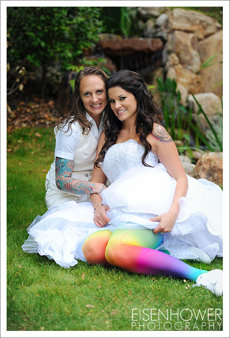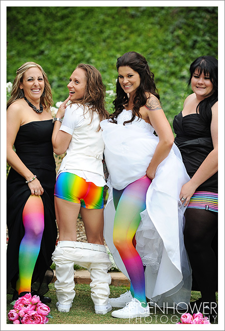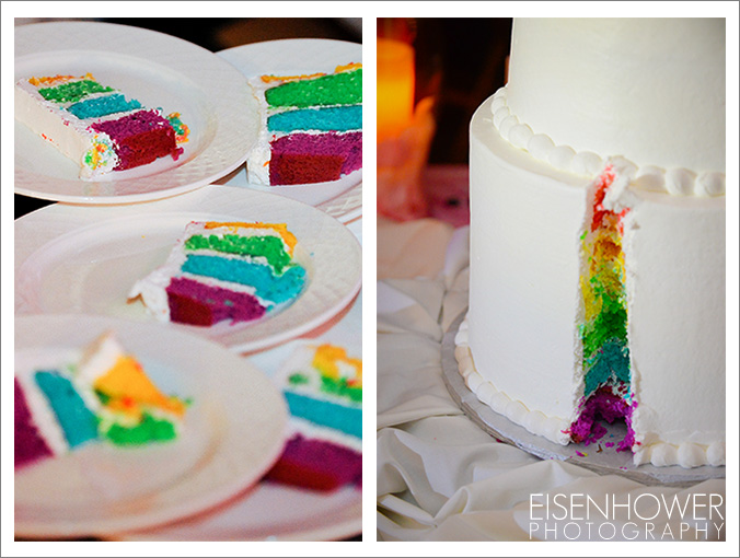The two were already technically married in a civil ceremony, but they wanted to have a ‘traditional’ wedding too. So they selected the beautiful Pala Mesa Resort and celebrated (in a big way) with their family and friends. Dad and I had a fantastic time capturing this event. Their theme was “Business on the Outside, Party on the Inside). The idea was for the wedding to look classic, and even traditional, on the outside. But then to subtly add a rainbow theme by having the bridal parties wearing rainbows under their elegant formal wear, and having rainbow layers inside their simple, white cake. The result was perfect, and made for some really fun photos.