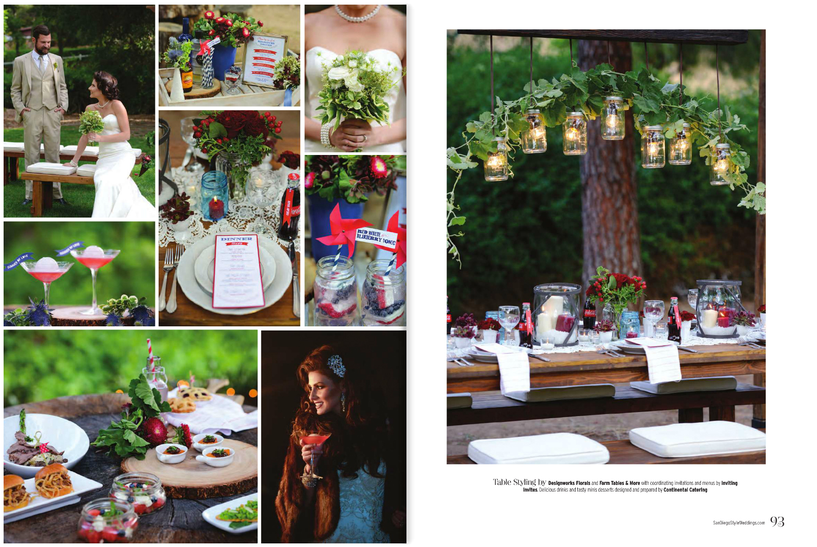 Last spring we worked with some fantastic local wedding vendors, all San Diego Style Weddings magazine advertisers, to put together a styled shoot that would feature all of our work. After some brainstorming we agreed on a “Vintage Americana” theme. Because July 4 falls on a Saturday this year, we figured some brides might be looking to be inspired with unique ways to incorporate the patriotic color scheme. Our little team had a great time pulling together a concept that combined vintage elements and retro styling, using red, white and blue, set against a beautiful ranch background. We were all so pleased to see our images featured across two spreads in San Diego Style Weddings Magazine.