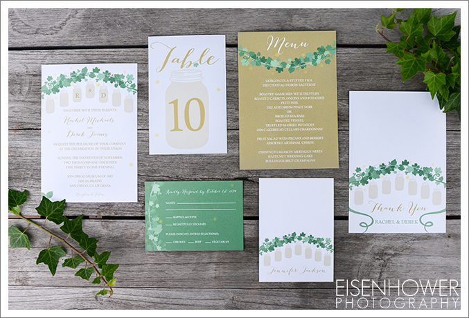 So, funny story about this collection. When I saw the ivy decorating the arch of mason jars, I told her “Hey, how cool! This design looks just like the decor that we used in our styled shoot last year!” When I showed her the photos from the shoot, she couldn’t believe it – the photo that she used as inspiration for this collection just happened to be one that we took, which had been posted on Pinterest! :-) What an honor – and wow, small world!
