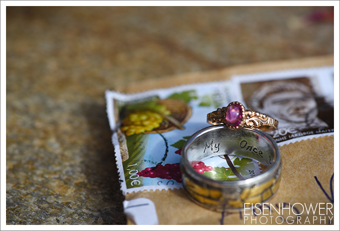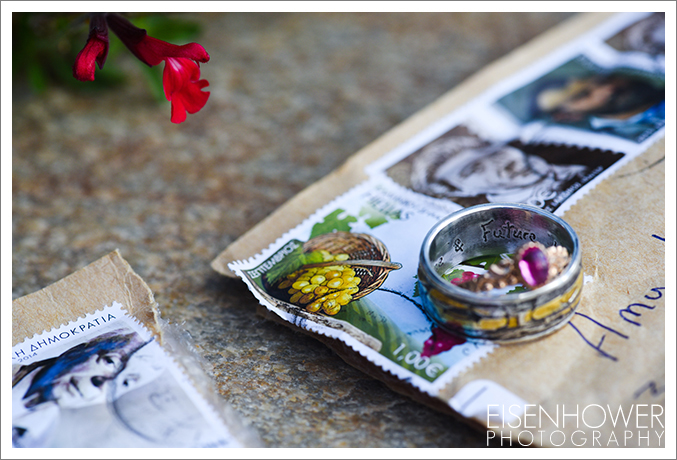Dick took these images of Amy and Madison’s rings. I usually try to get photos of wedding rings with and without their boxes. I love that because these rings were mail-ordered, Dick used the colorful stamps as a background.