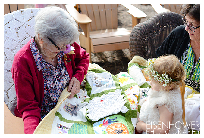 Guest seating was draped in blankets filled with personal meaning. Here Dede inspects Waylond’s baby quilt with her great granddaughter.